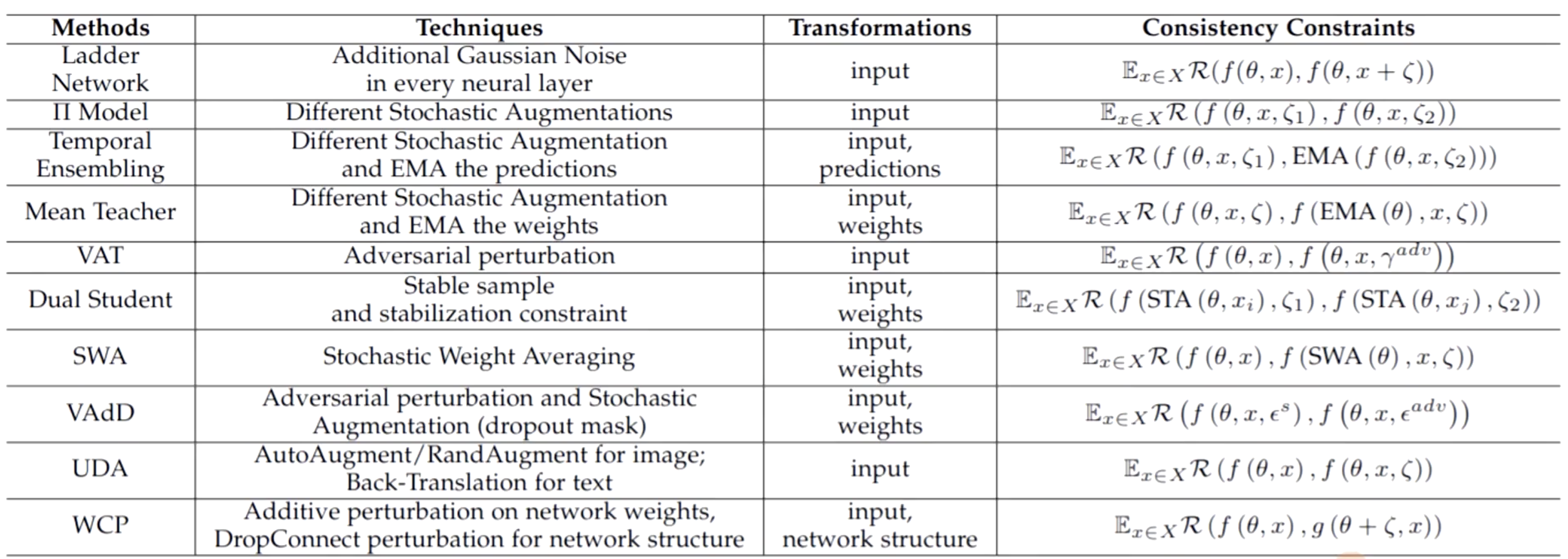 上表中是半监督学习经常刷榜的模型,它们的核心都在一致性正则上。比如说第三个,对于两种扰动,第二个扰动加了EMA(指数平均);第四个是在第二种扰动中对模型参数加了EMA;最后一个对于同样的模型,不增广,而是直接在模型上加了扰动。
