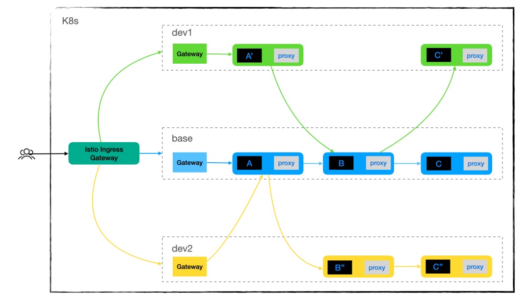 假设用户基准环境 base 中部署了 3 个服务 A / B / C,请求链路为 A->B->C。基于基准环境创建了 2 个子环境 dev1 和 dev2,dev1 中部署了服务 A' / B',dev2 中部署了服务 B'' / C''。