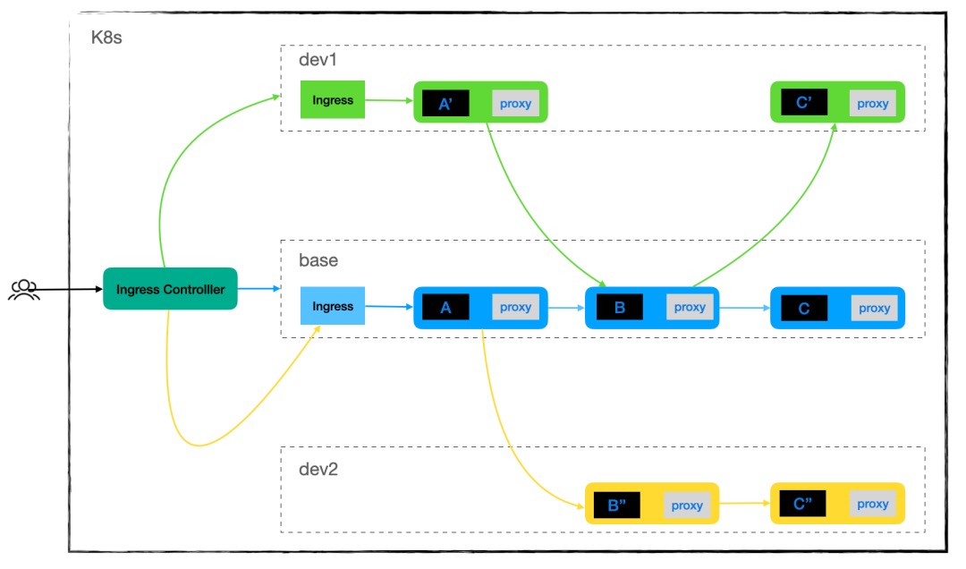 为了实现从集群外部对集群中自测环境的访问,需要分别在 base 和 dev1 环境中部署 Ingress,基于 Host 将外部请求路由到相应的环境中 (由于 dev2 没有部署入口访问服务 A,故不用部署 Ingress,通过 base 环境的 Ingress 将外部请求路由到 dev2 环境)。
