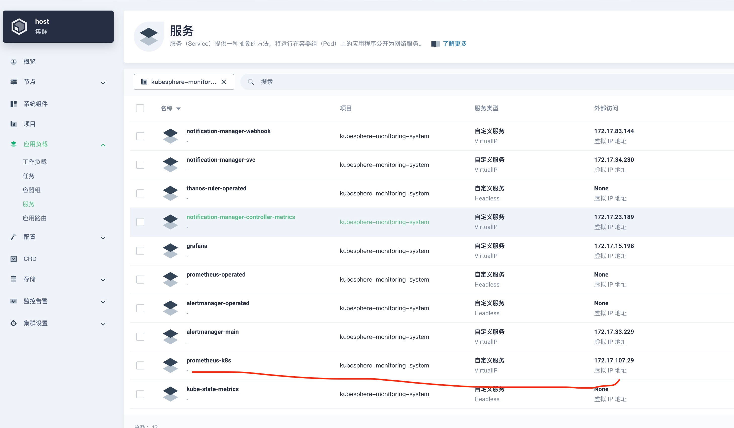 我们可以在集群中的如下地址找到 KubeSphere 系统集成的 Prometheus 服务,如图所示