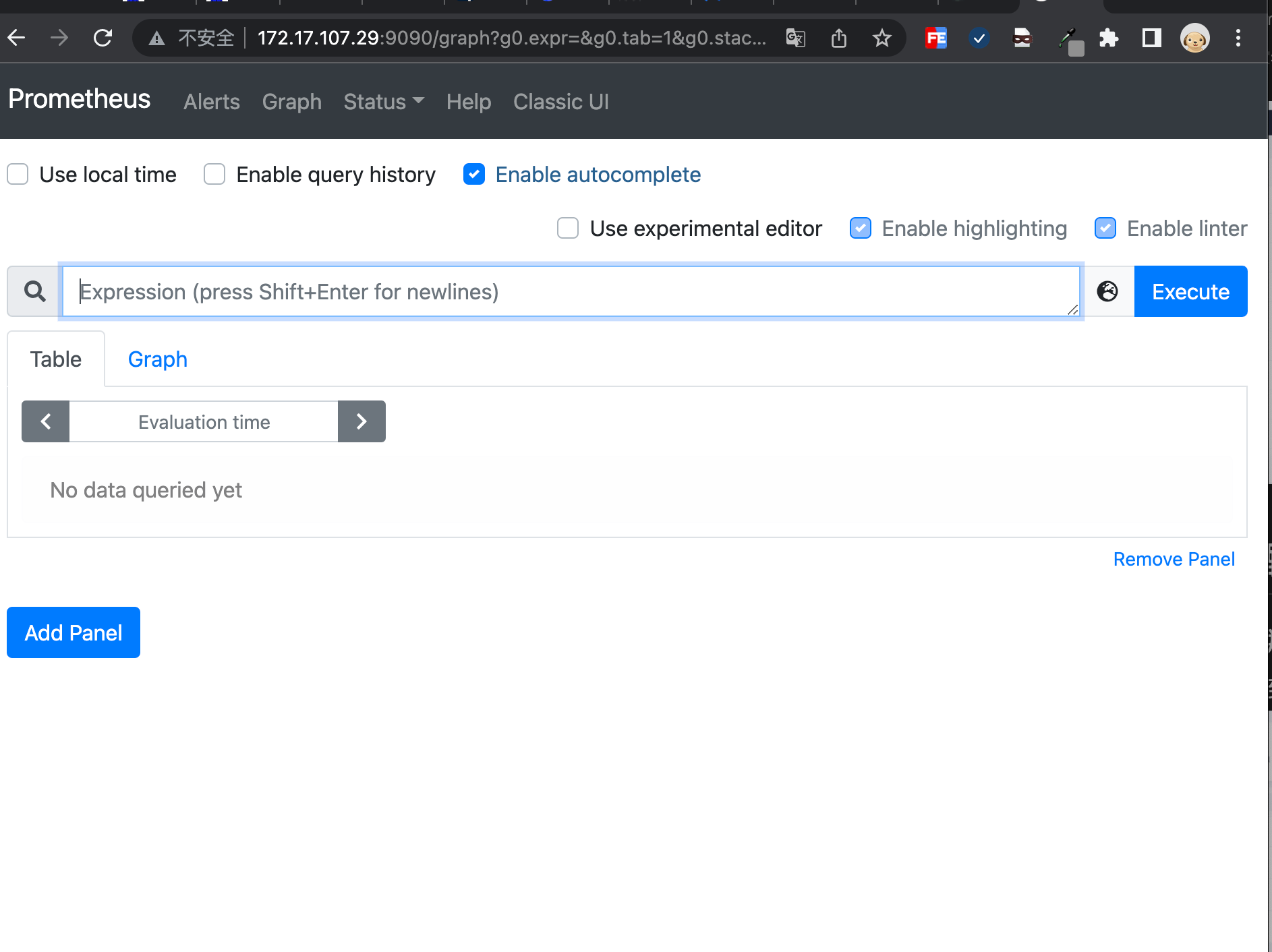 通过 3.1.1 我们可以看到普罗米修斯服务的 ip 地址为 172.17.107.29,默认端口为 9090。我们在浏览器输入 http://172.17.107.29:9090,可以看到如图所示: