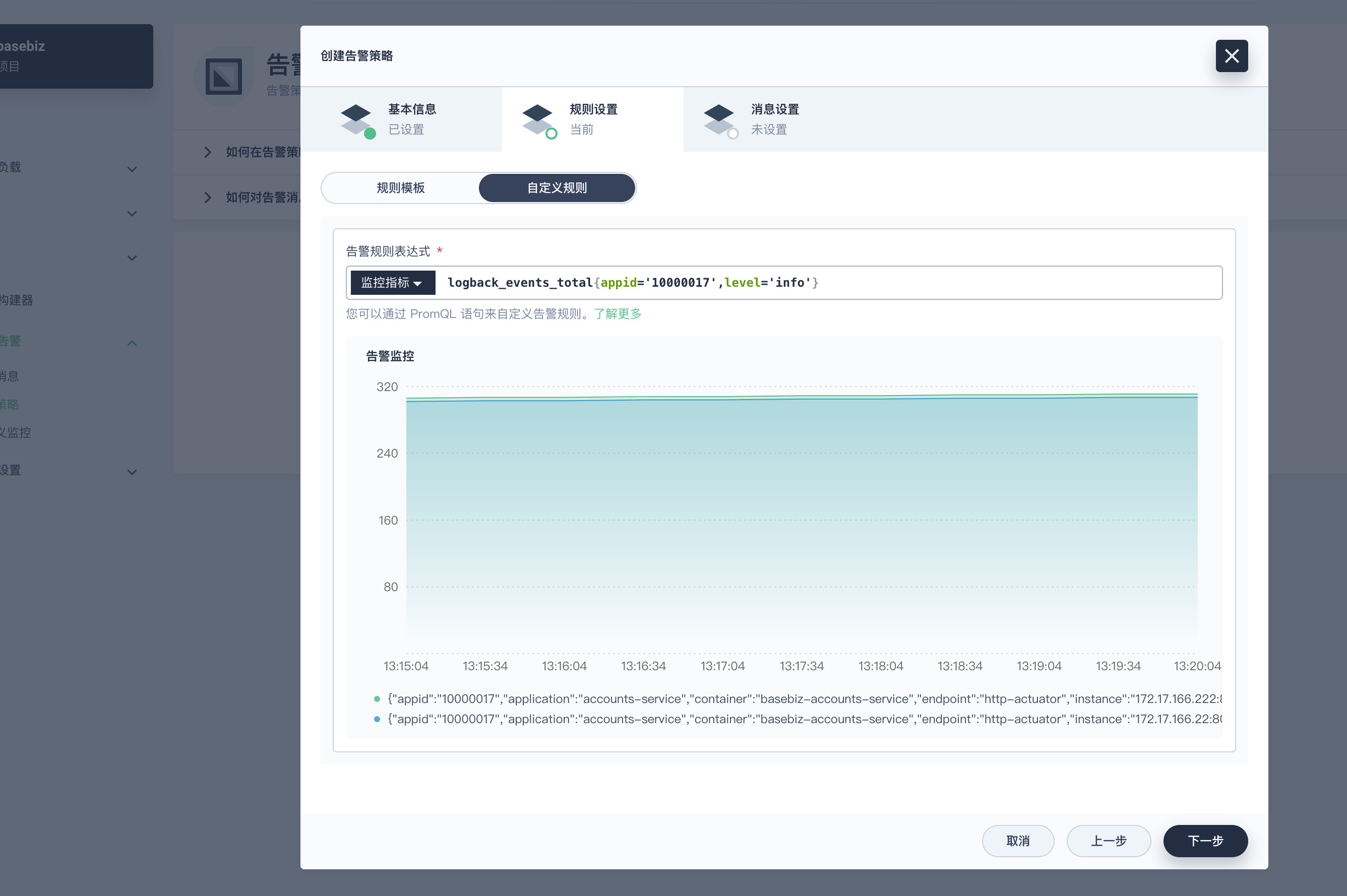 我们也可以使用系统集成的告警策略设置基于采集数据的自定义告警设置。例如: