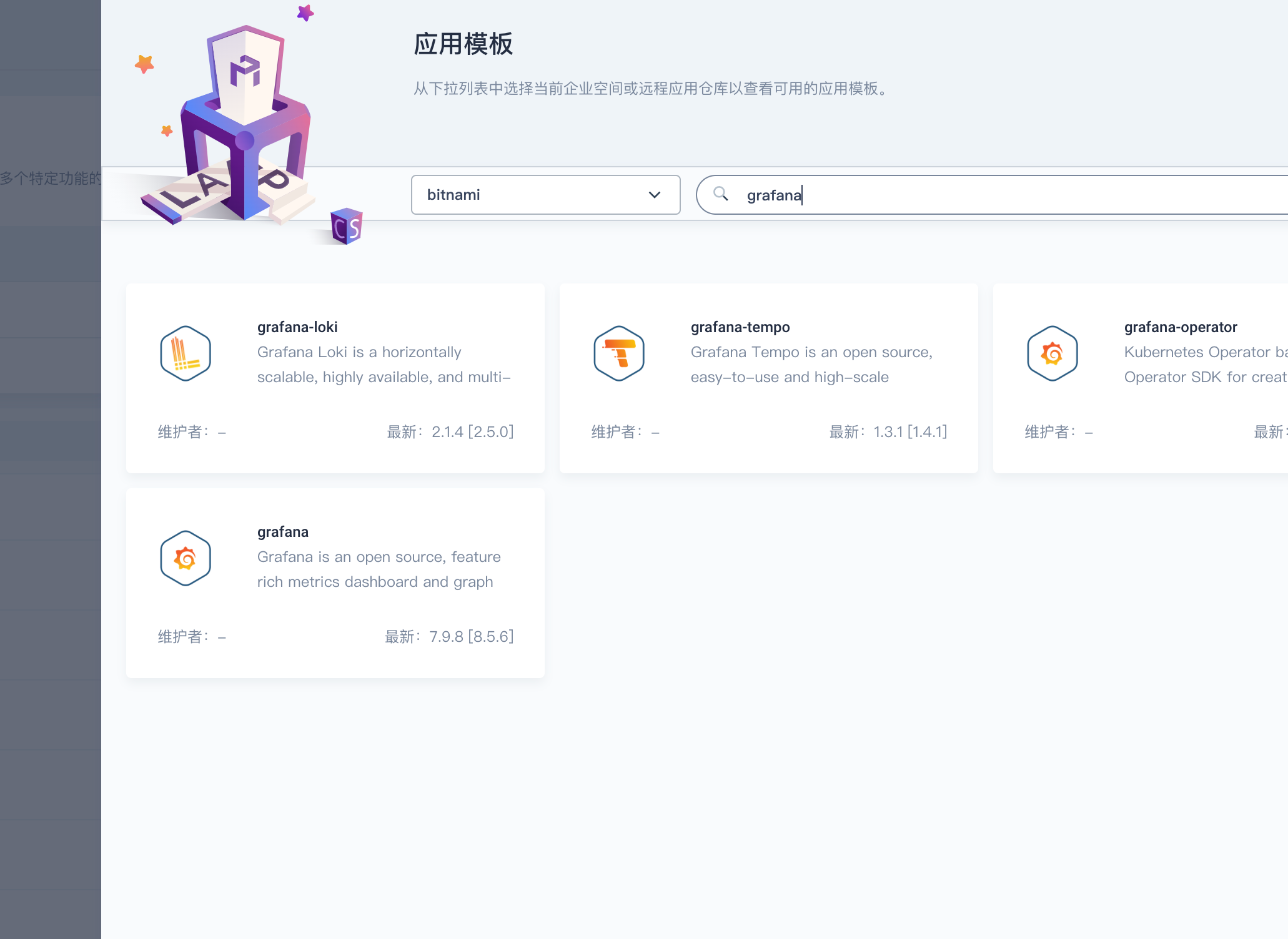 - 弹出对话框中点击从应用模版,从应用仓库列表中选择我们刚刚添加的 bitnami 的仓库,搜索 Grafana 点击后安装即可。