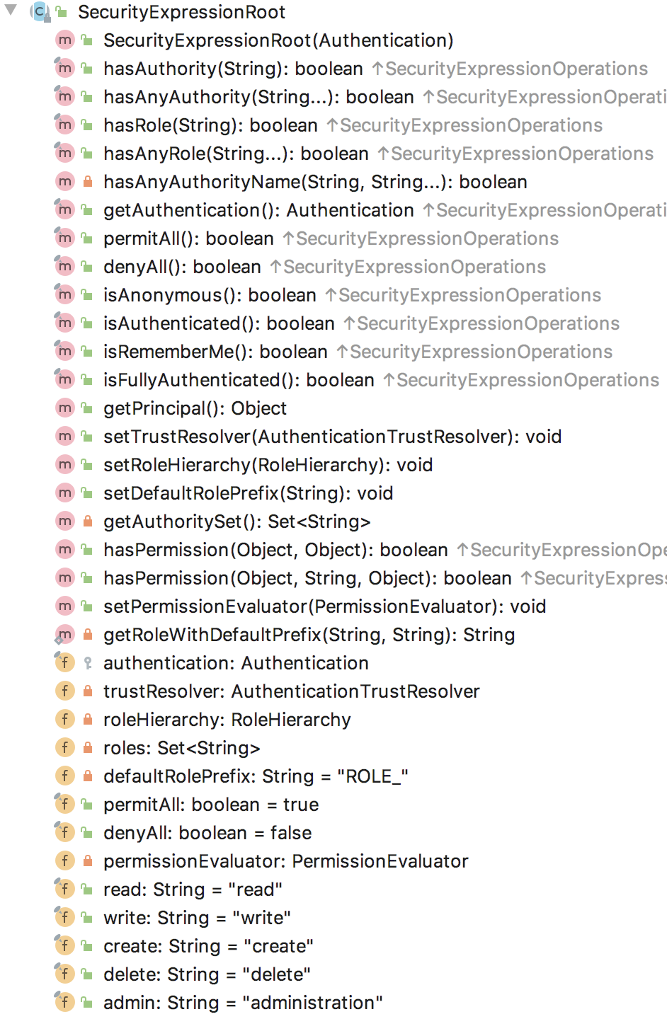 首先我们自定义一个类继承自 SecurityExpressionRoot 并实现 MethodSecurityExpressionOperations 接口(本来直接继承自 MethodSecurityExpressionRoot 即可,但是因为这个类不是 public 的,没法继承,所以我们就实现 MethodSecurityExpressionOperations 接口即可):