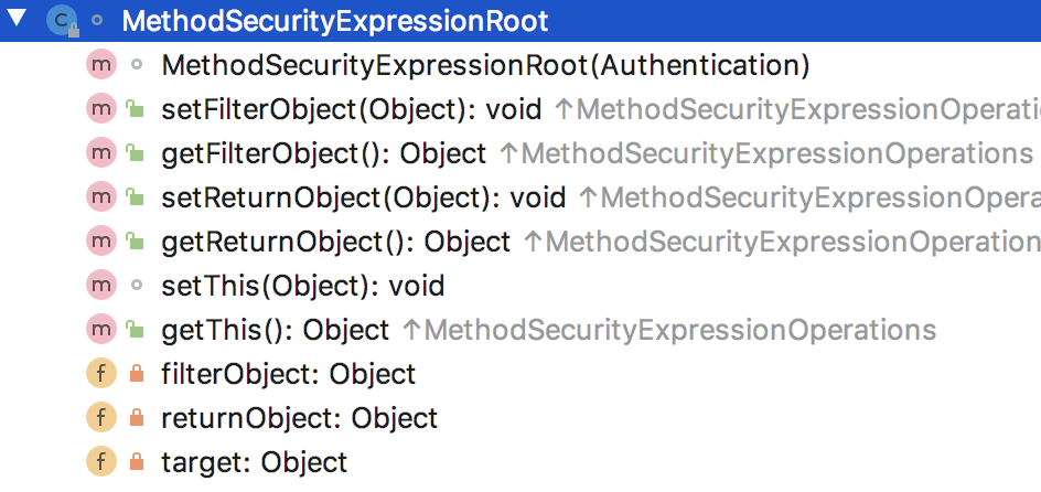 MethodSecurityExpressionRoot 类实际上继承自 SecurityExpressionRoot,只不过增加了过滤对象以及返回值对象。我们来看下 MethodSecurityExpressionRoot 的方法摘要: