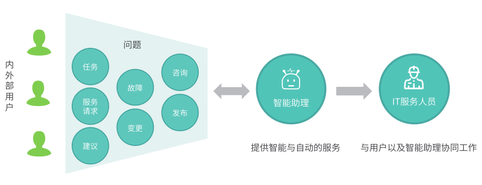 面向IT服务管理的实践,基于即时通讯(IM)前端的智能服务助理,应该具备以下能力:为终端用户提供关于 QA 问答、工单辅助、监控辅助、巡检辅助、服务请求以及任务脚本的智能与自助服务,促进用户和IT服务人员的扁平化协作,提升沟通效率、降低人力成本。