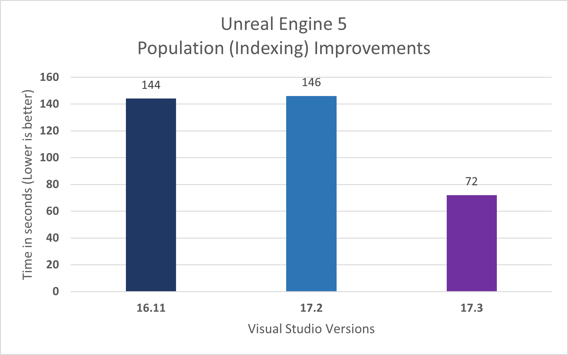 在新的虚幻引擎 5 解决方案中编写代码时,最新版本的 VS2022 与 VS2019 相比有了巨大改进。在 VS 2019 16.11 中,完全索引一个全新的 C++ UE5 解决方案需要 144 秒。使用 VS2022 17.3 时,完全索引相同的 UE5 解决方案节省了一半时间,只需 72 秒。无论是创建新的 UE5 项目还是从现有存储库克隆,代码在 17.3 中的索引速度都会更快。