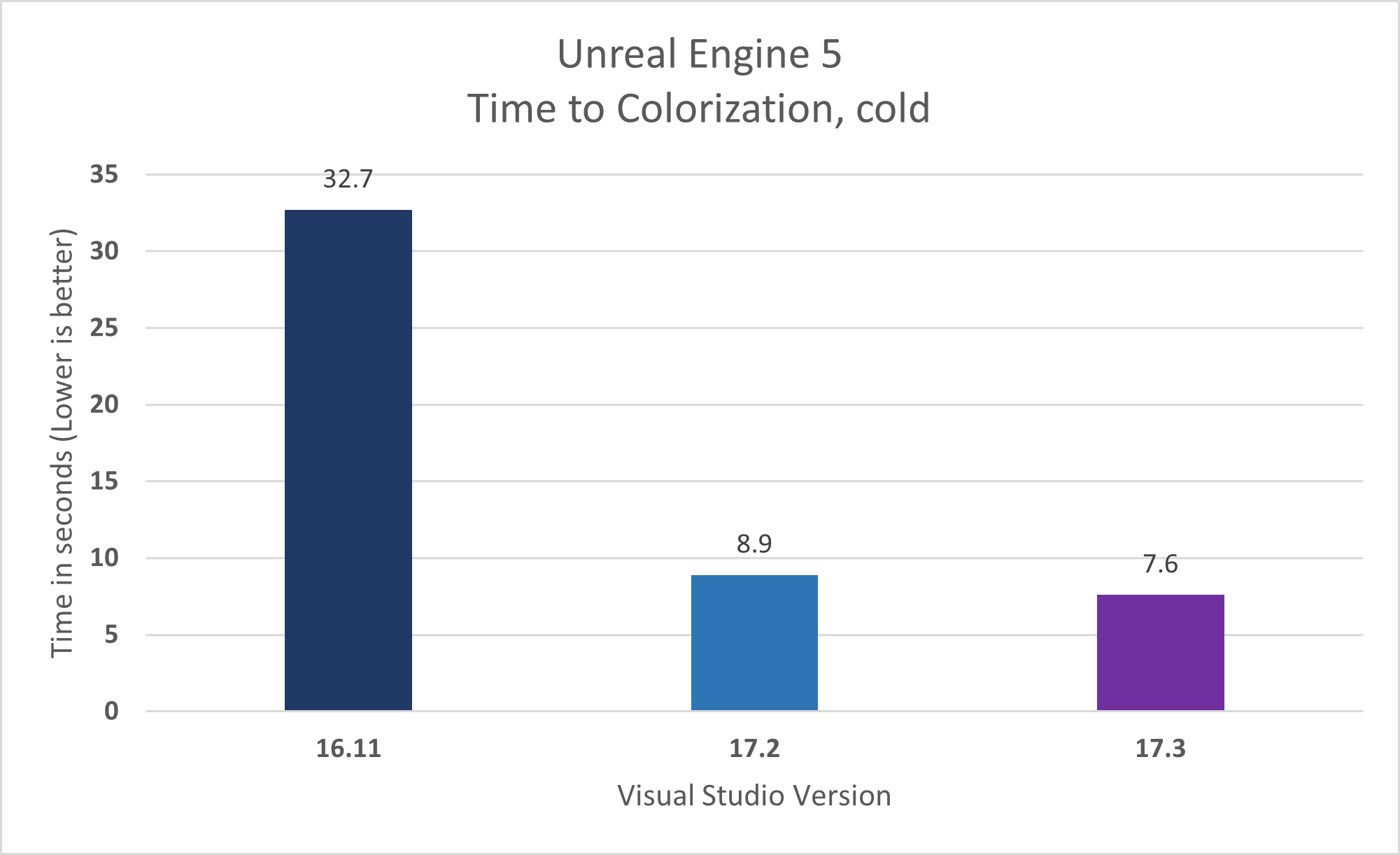 以下是基于 Intel Core i7-9700 CPU @ 3Ghz、64GB RAM 和 SSD 的桌面,使用 UE5 和超过 300,000 个文件的 Chromium 存储库进行了基准测试。分别测试了在 VS 2019 16.11 版本和 VS 2022 17.2 、17.3 版本的性能表现。