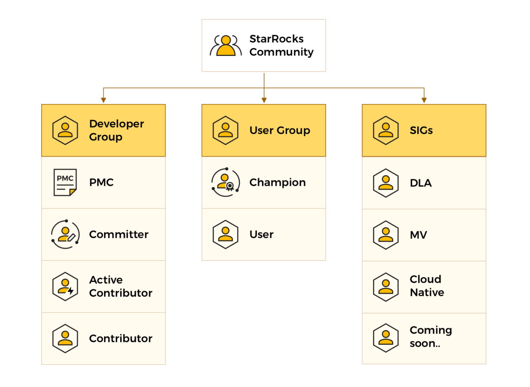 StarRocks 社区说:熟悉开源的朋友们可能都听过 The Apache Way 的一个核心原则——Community over code,社区不止于代码。一个充满生命力的软件,离不开一个健康的社区。为了帮助大家更有效地参与到社区当中,并让大家在社区里能更有归属感,StarRocks 首次公布了社区架构。我们把社区分成了 以代码共建为主的 Developer Group 、 由众多使用 StarRocks 的用户所组成的 User Group , 还有 不同的 SIGs (专项兴趣小组) ,让开发者可以根据自己的兴趣和能力投身到自己感兴趣的项目/组织中。你是否想成为大数据行业先锋,与 StarRocks 一同构建“极速统一”的数据分析新范式?你是否想收获一群志同道合、日常交流技术的小伙伴?StarRocks 社区新玩法已全线启动,只待你来解锁!