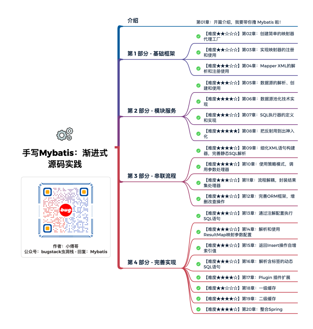 如果你也想有这样酣畅淋漓的学习,千万别错过傅哥为你编写的资料《手写Mybatis:渐进式源码实践》目录如图所示,共计20章