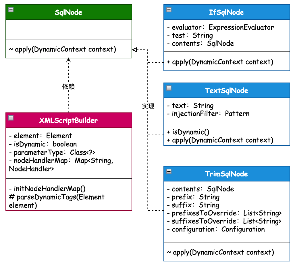 场景介绍:在 Mybatis XML 动态的 SQL 配置中,共提供了9种(trim/where/set/foreach/if/choose/when/otherwise/bind)标签的使用,让使用者可以组合出各类场景的 SQL 语句。而 SqlNode 接口的实现就是每一个组合结构中的规则节点,通过规则节点的组装完成一颗规则树组合模式的使用。 具体使用源码可以阅读《手写Mybatis:渐进式源码实践》 -
