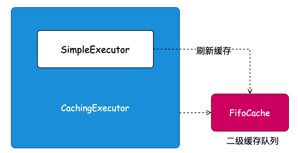 场景介绍:Mybatis 的所有 SQL 操作,都是经过 SqlSession 会话调用 SimpleExecutor 简单实现的执行器完成的,而一级缓存的操作也是在简单执行器中处理。那么这里二级缓存因为是基于一级缓存刷新操作的,所以在实现上,通过创建一个缓存执行器,包装简单执行器的处理逻辑,实现二级缓存操作。那么这里用到的就是装饰器模式,也叫俄罗斯套娃模式。 -