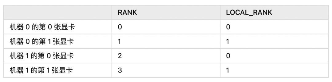 以 2 机 2 卡 为例,每张显卡的 LOCAL_RANK 与 RANK 对应情况如下: