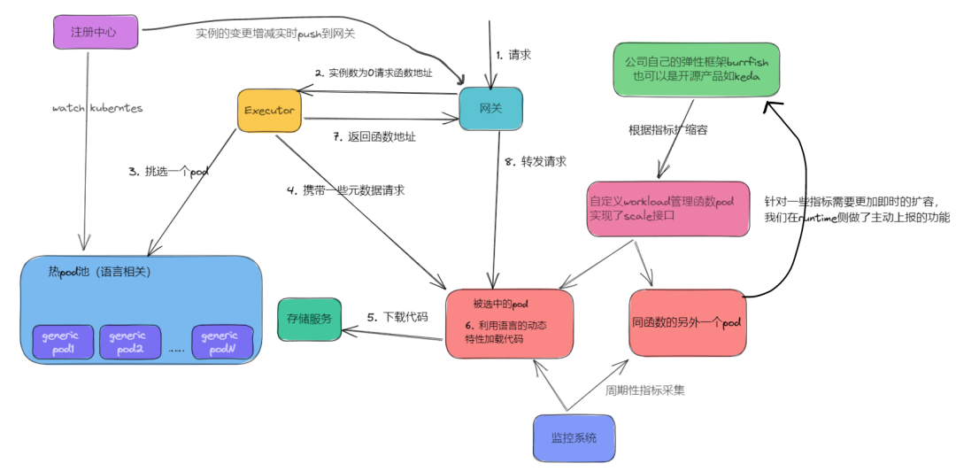 上图是从fission官方文档拿下来的。左下角Warm Environment Pool即是所谓的热pod池。里面的pod是已经启动了的服务实例,实例已经走完了k8s调度、拉镜像、起服务等耗时的步骤。我们这里从步骤3看起,当请求打到入口代理router时,其会从executor处拿一个函数的访问地址(步骤3),而executor若发现函数实例为0,会从热pod池里随机挑一个pod,然后到pod自己去下载代码,利用语言的动态加载机制加载用户代码(步骤5、6、7),完成上述步骤意味着pod已经具备提供服务能力,router拿到返回的地址直接请求函数即可。