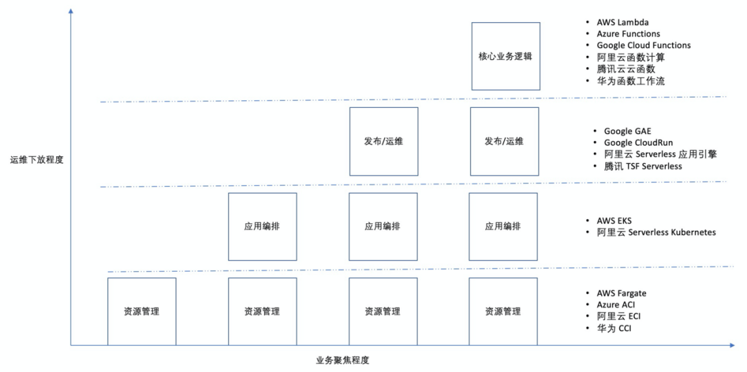图里以业务聚焦程度和运维下放(给云厂商)程度为坐标轴,给市面上的产品大体做了区间划分。FaaS产品在这两个维度都是最高的那档,意味着这种形态的产品已经在最大限度上让开发者可以聚焦在自己的业务逻辑处理上而不用关心太多的非功能性需求。