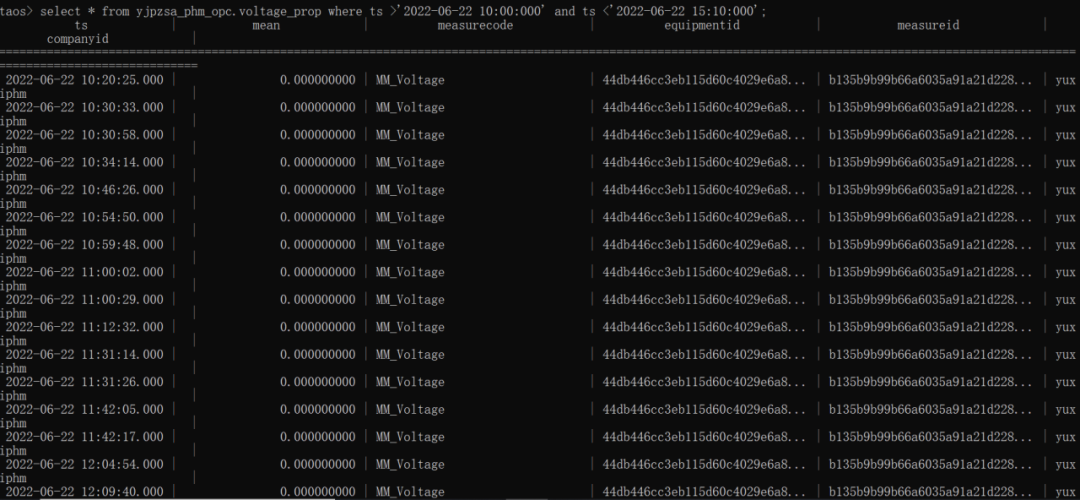 select * from yjpzsa_phm_opc.voltage_prop where ts >'2022-06-22 10:00:000' and ts <'2022-06-22 15:10:000';