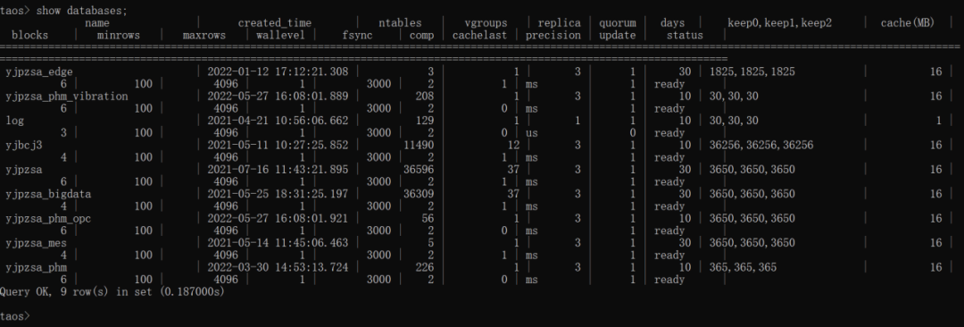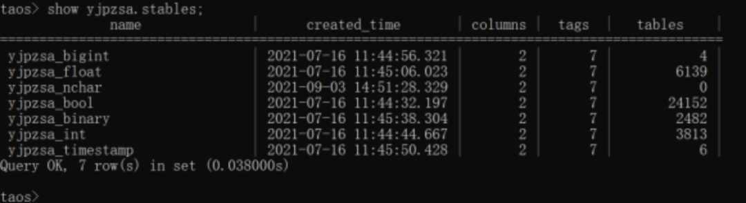 分别为 yjpzsa_bigint,yjpzsa_float,yjpzsa_nchar,yjpzsa_bool,yjpzsa_binary,yjpzsa_int,yjpzsa_timestamp。