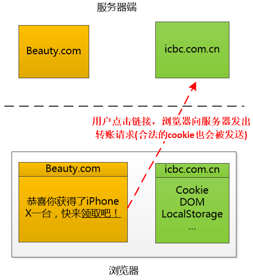 “其实吧,我们想去借一个Cookie来用,关键是要让我们Beauty.com的JavaScript在目标浏览器上运行,然后访问爱存不存银行(icbc.com.cn)的cookie,可是现在他们用了同源策略,我们网站的JavaScript不允许访问别人网站的东西,那这条路就行不通了。”