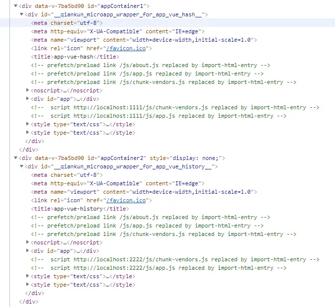 <template><div id="app"><header><router-link to="/app-vue-hash/">app-vue-hash</router-link><router-link to="/app-vue-history/">app-vue-history</router-link><router-link to="/about">about</router-link></header><div id="appContainer1" v-show="$route.path.startsWith('/app-vue-hash/')"></div><div id="appContainer2" v-show="$route.path.startsWith('/app-vue-history/')"></div><router-view></router-view></div></template><script>import { loadMicroApp } from 'qiankun';const apps = [{name: 'app-vue-hash',entry: 'http://localhost:1111',container: '#appContainer1',props: { data : { store, router } }},{name: 'app-vue-history',entry: 'http://localhost:2222',container: '#appContainer2',props: { data : store }}]export default {mounted() {// 优先加载当前的子项目const path = this.$route.path;const currentAppIndex = apps.findIndex(item => path.includes(item.name));if(currentAppIndex !== -1){const currApp = apps.splice(currentAppIndex, 1)[0];apps.unshift(currApp);}// loadMicroApp 返回值是 app 的生命周期函数数组const loadApps = apps.map(item => loadMicroApp(item))// 当 tab 页关闭时,调用 loadApps 中 app 的 unmount 函数即可},}</script>