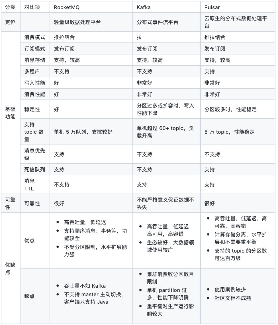 以下是 RocketMQ、Kafka、Pulsar 的对比情况: