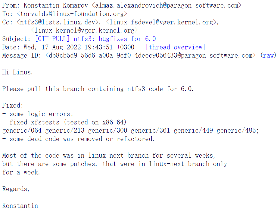 在前不久发布的 Linux 6.0 中,CEO Konstantin Komarov 提交了针对新版内核的代码重构补丁,以及错误修复。不过他提交 commit 的时间节点却十分不凑巧——刚好是合并窗口关闭后的几天。