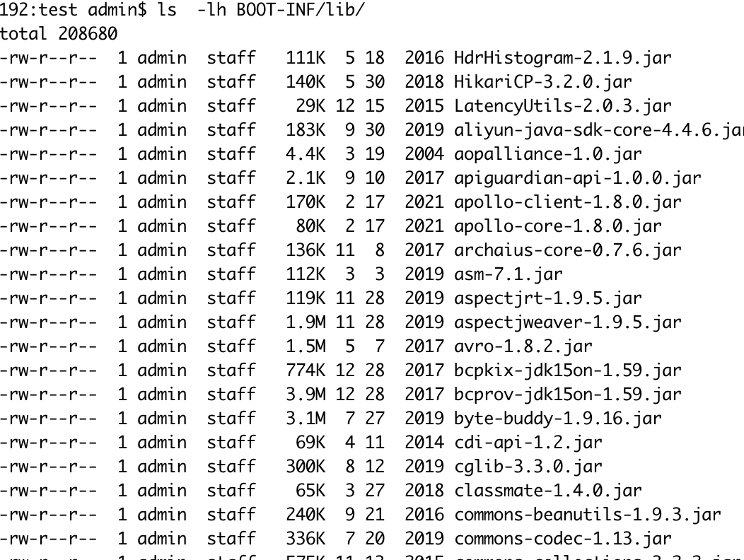 以Java项目为例,通过与发布平台打通,获得项目编译后的Jar文件,JAR 文件格式是以 ZIP 文件格式为基础,对Jar文件进行解压,可在BOOT-INF/lib/目录下获取全部第三方依赖包信息。