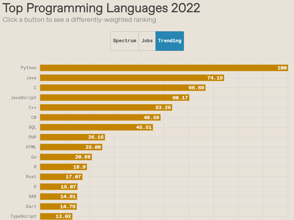 IEEE Spectrum 2022 年度编程语言排行榜现已发布。该榜单一年发布一次,今年是第九年。此次的榜单改进和简化了交互式排名工具,并在内部进行了其他改动;但总体仍是结合来自不同来源的多个指标,来估计不同语言的相对流行度。
