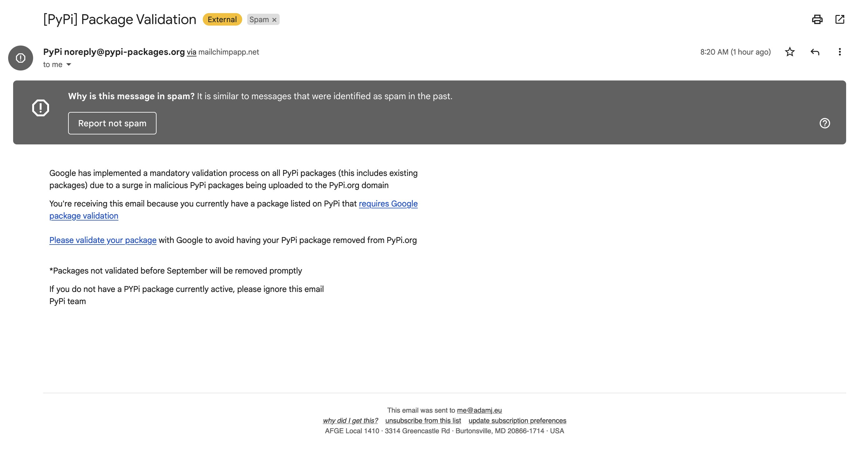 PyPi 贡献者收到了一封网络钓鱼电子邮件,要求他验证他的 PyPi 凭据,导致他进入一个虚假的 PyPi 登录页面,试图窃取他的 PyPi 凭据。