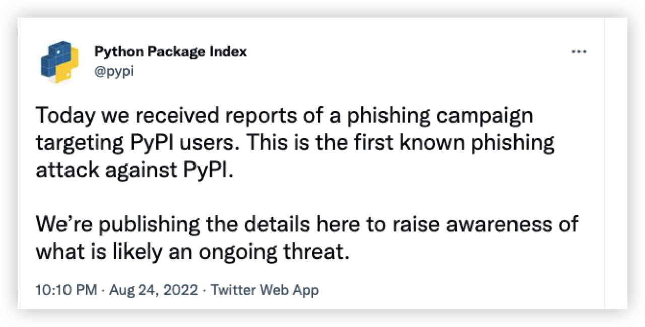 PyPi 的官方推特账号报告称,这次网络钓鱼攻击与数百个恶意 python 包在内以及更广泛的事件有关。这些恶意软件包已从注册表中删除。