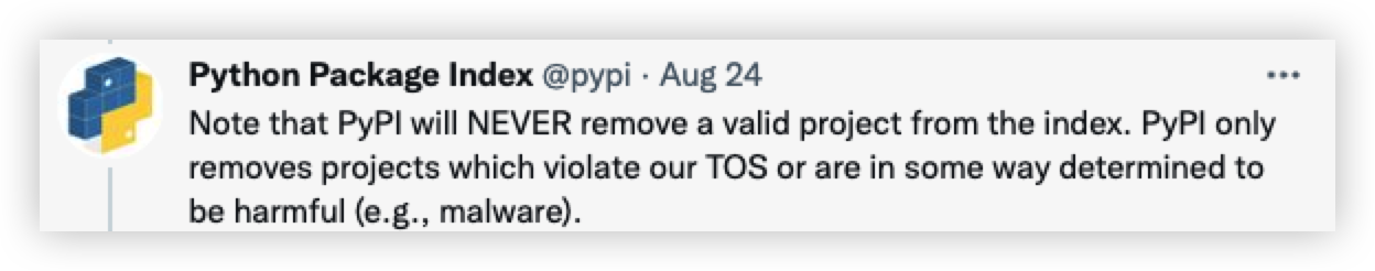 PyPi官方已声明在不违反TOS或确定为有危害的项目时候,并不会从索引中删除有效的项目。