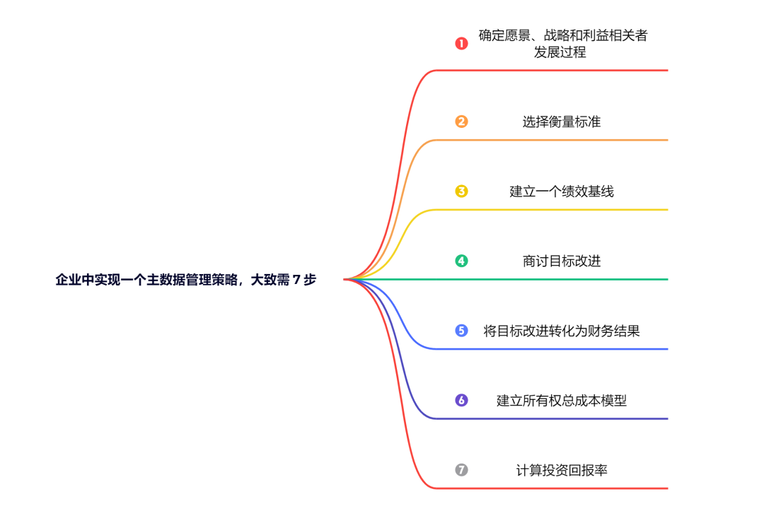 Gartnter 在《成功实施主数据管理的 7 个步骤》[1]中指出,在企业中实现一个主数据管理(MDM)策略大致需要 7 步: