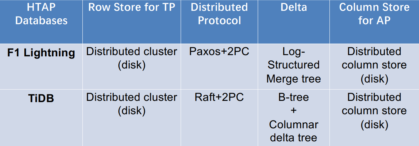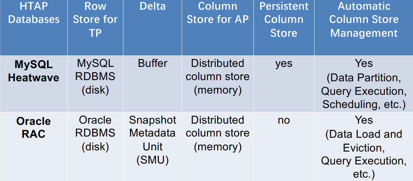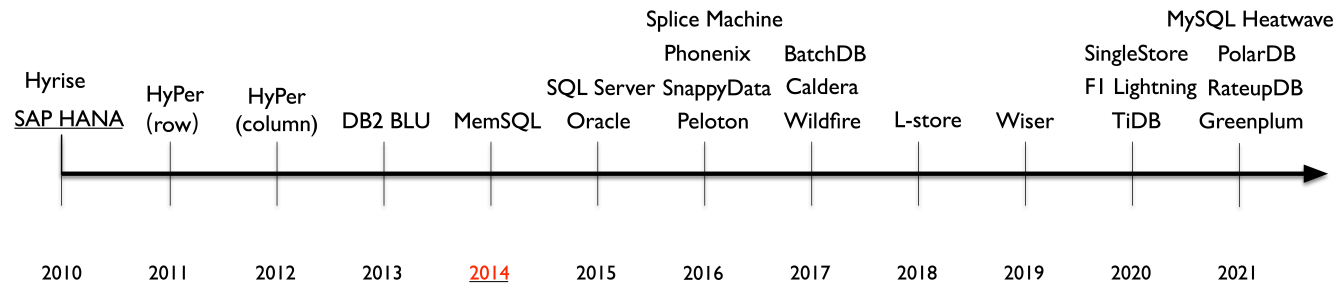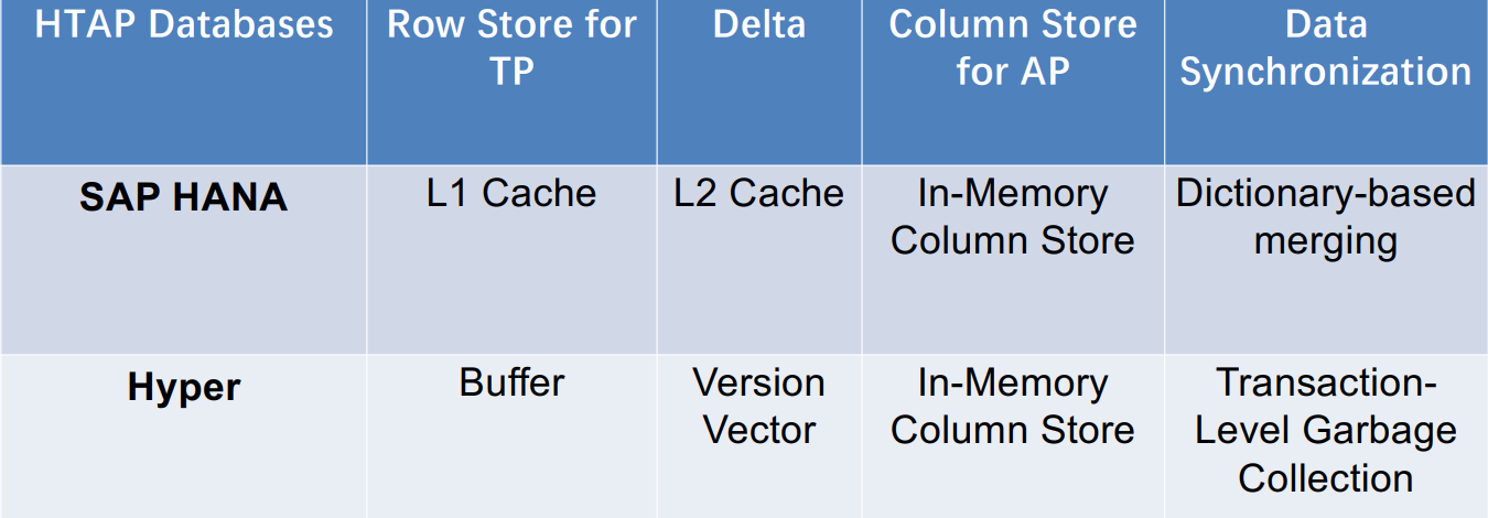第一阶段(2010-2014) :HTAP 数据库主要是采用主列存(primary column store)的方式。如SAP HANA、HyPer、DB2和BLU等。