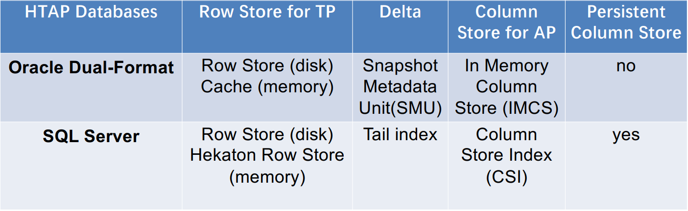 第二阶段(2014-2020) :HTAP 数据库主要是扩展了以前主行存的技术,在行存上加上了列存。如SQL Server,Oracle和L-store等。