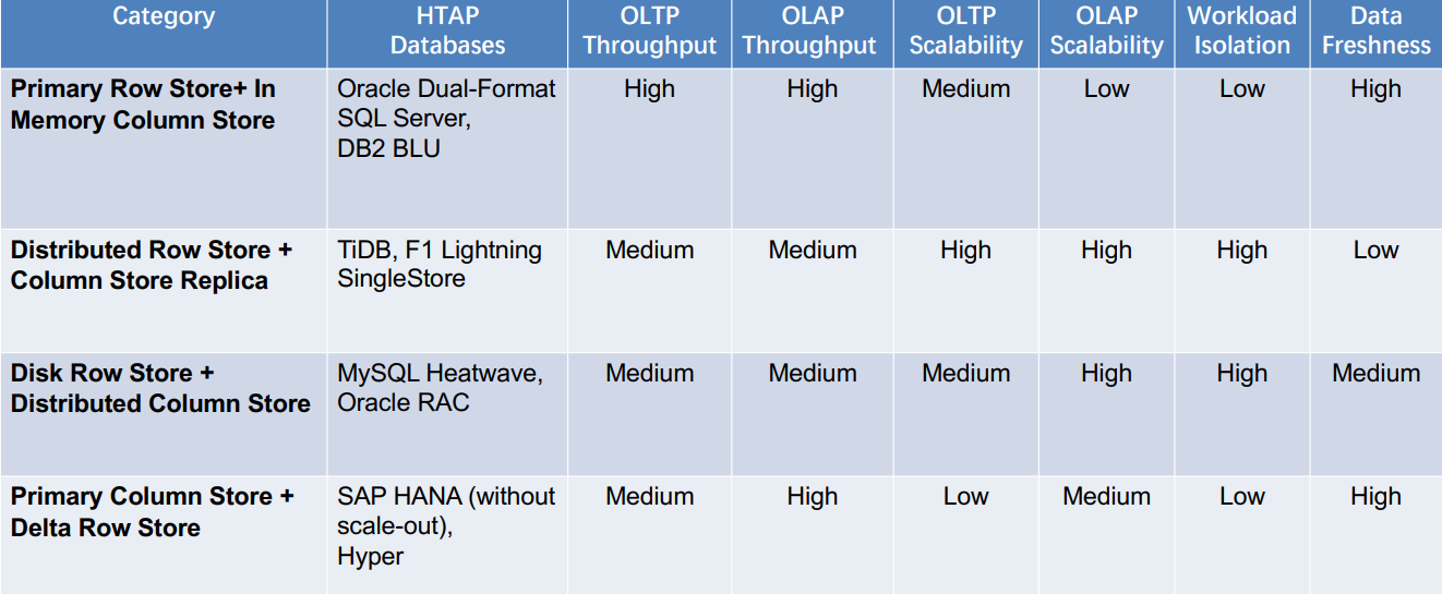 HTAP Databases :分享最新的 HTAP 数据库技术,总结它们主要的应用场景与优缺点,并根据存储架构对它们进行分类。