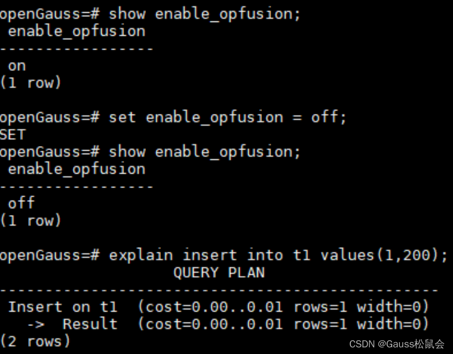 enable_opfusion用于控制是否对简单增删改查进行优化,简单insert语句在开启enable_opfusion时的执行计划如下