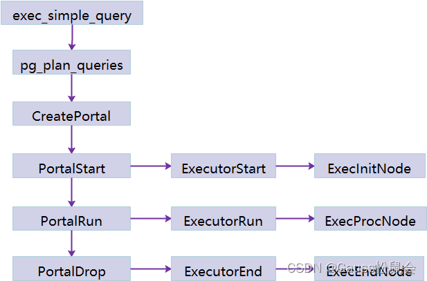 在这种执行流程中Portal是执行SQL语句的载体,每一条SQL对应唯一的Portal,不同的查询类型对应的Portal类型也有区别。