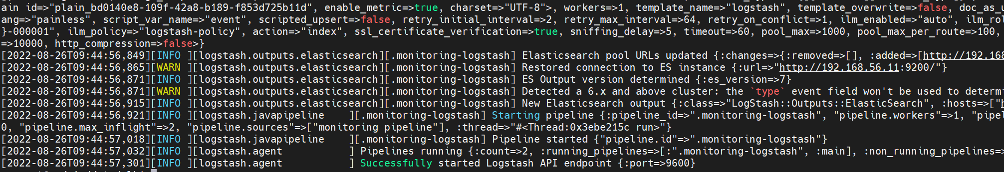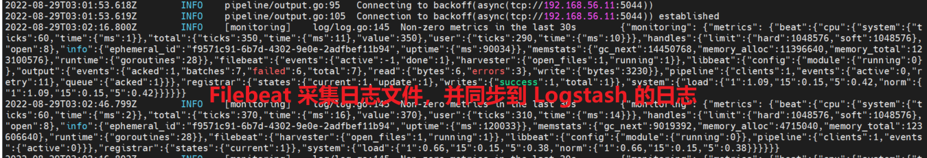 可以看到 Filebeat 采集日志文件,并同步到 Logstash 的日志。