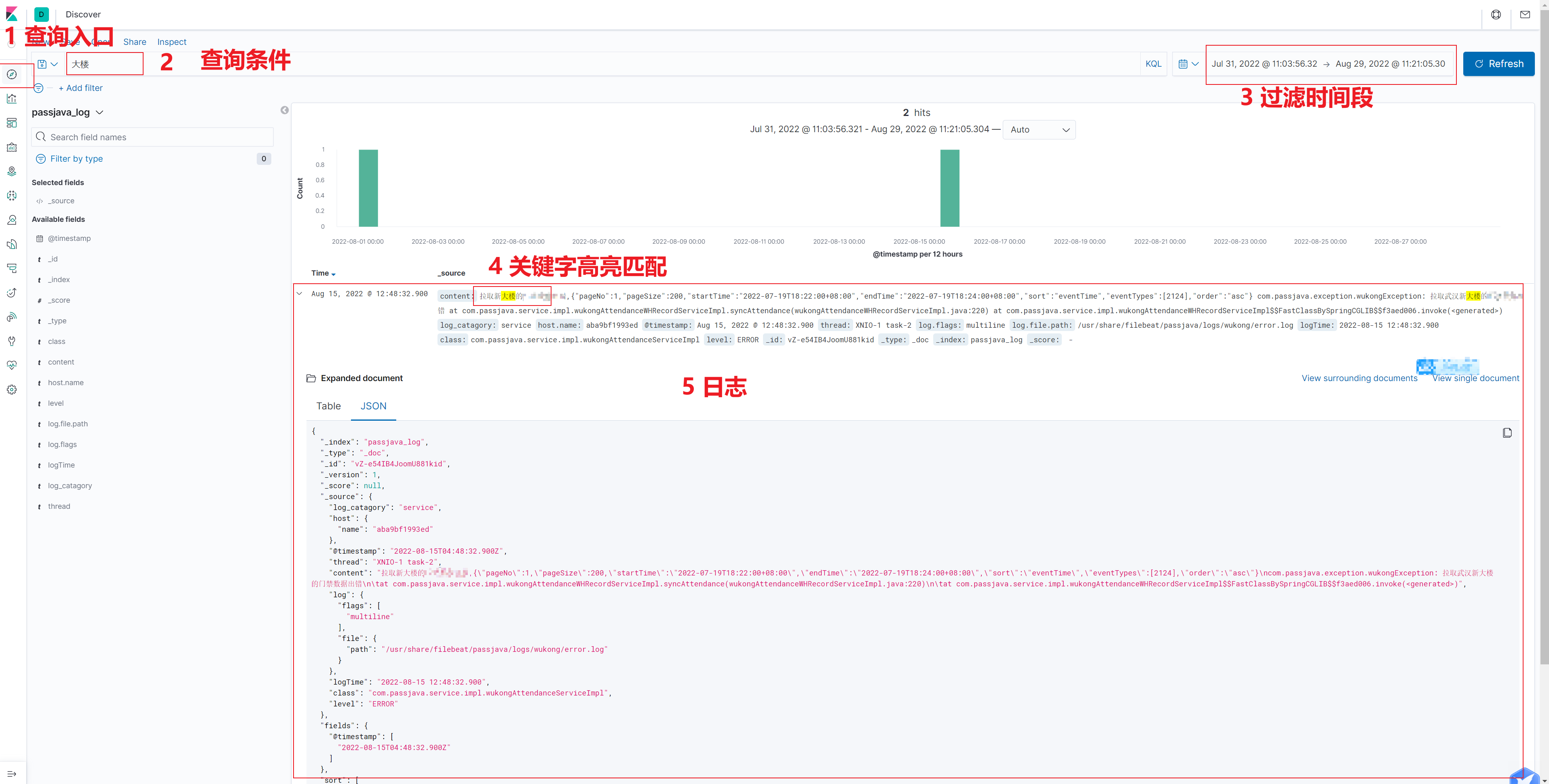 在 Kibana 搜索大楼 关键字,可以查到日志输出。需要注意的是,要选择对应的过滤时间段。