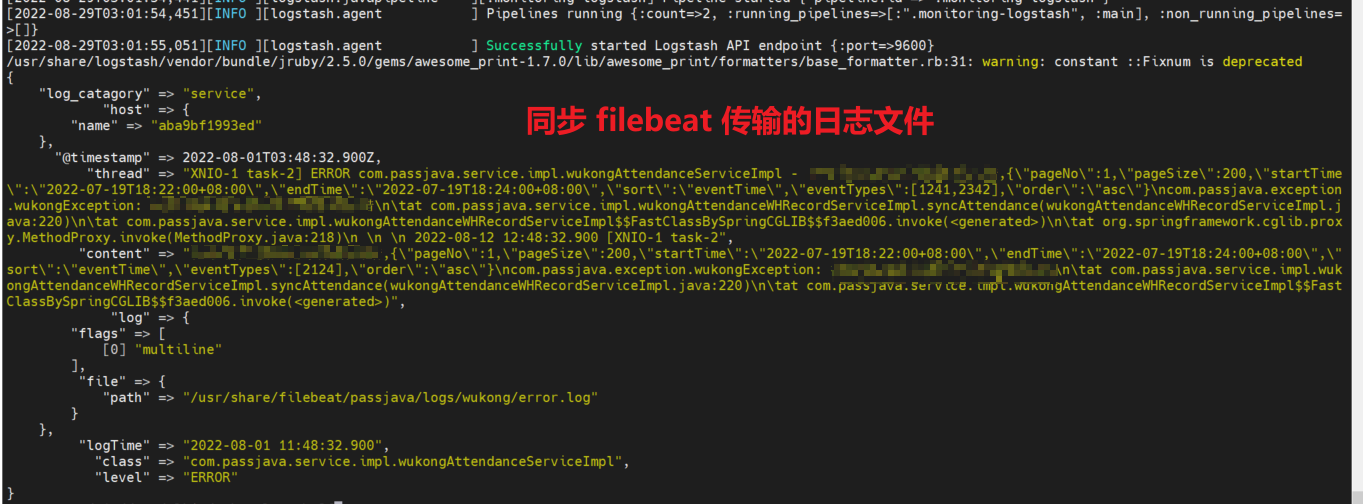 可以看到 logstash 收集到了 filebeat 传输的日志。