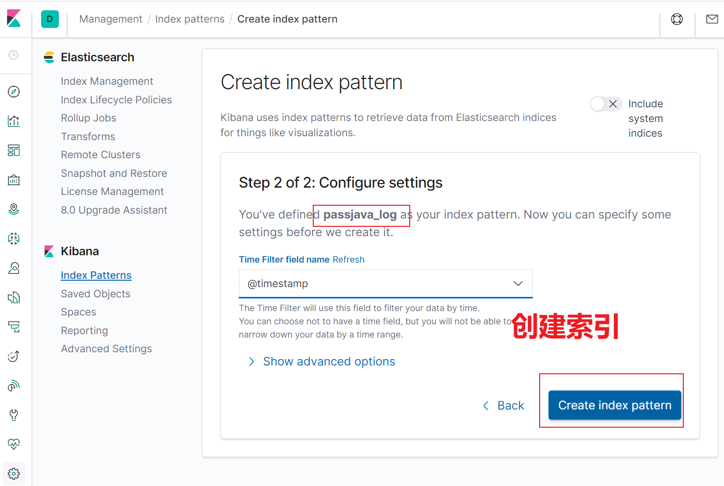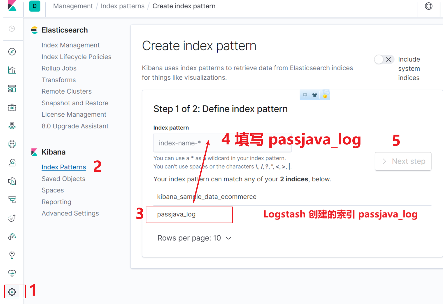 当 Logstash 将日志同步到 Elasticsearch 中后,就会自动在 Elasticsearch 中创建索引。然后我们需要在 Kibana 可视化控制台中创建一个对应的索引来查看日志。步骤如下所示: