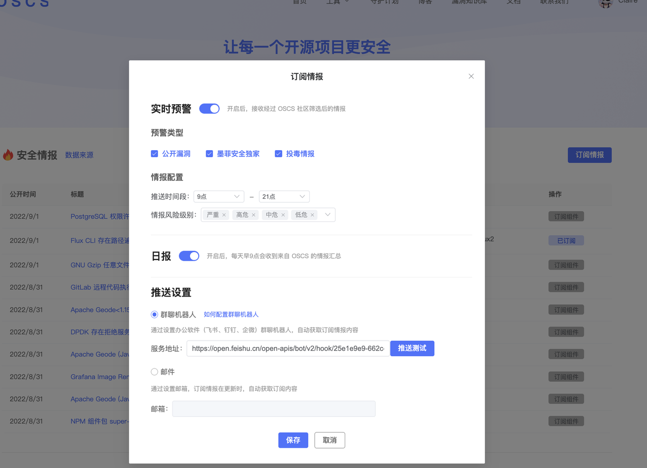 OSCS(开源软件供应链安全社区)通过最快、最全的方式,发布开源项目最新的安全风险动态,包括开源组件安全漏洞、事件等信息。同时提供漏洞、投毒情报的免费订阅服务,社区用户可通过配置飞书、钉钉、企业微信机器人,及时获得一手情报信息推送。