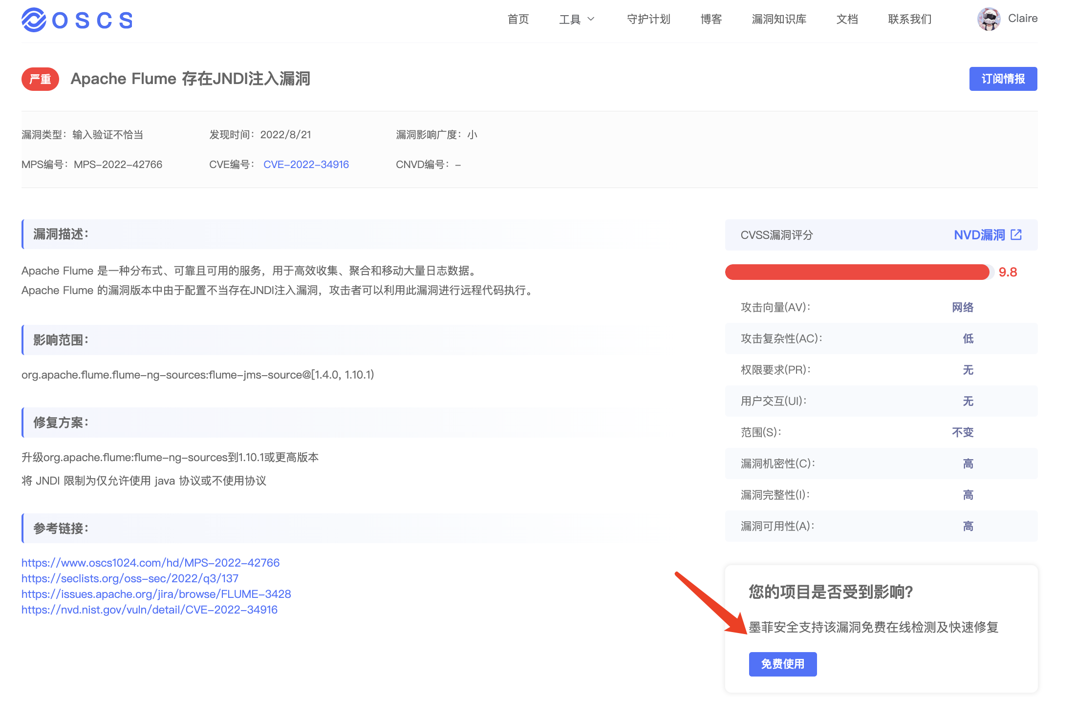 点击漏洞详情页右下方【免费使用】,即可快速体验墨菲安全专业的检测能力。提供代码安全检测、许可证合规评估等能力,目前支持 CLI 、IDE插件、GitHub多种检测方式,欢迎使用。