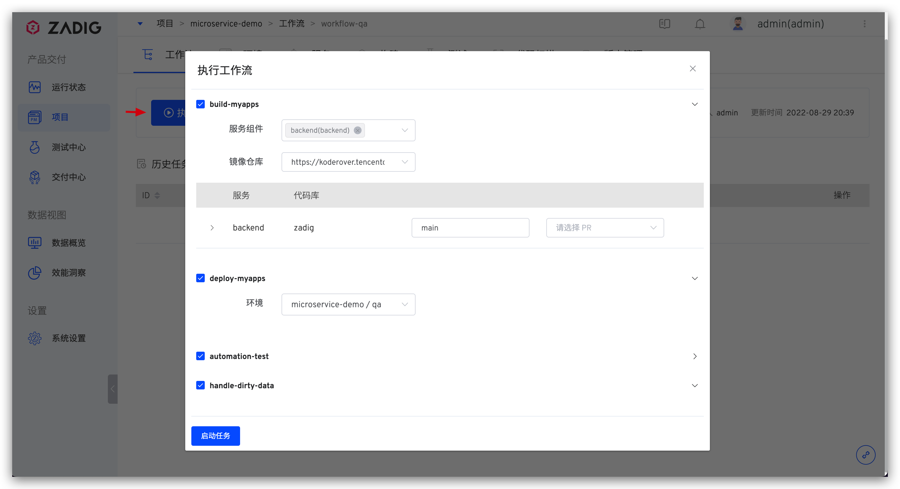 点击执行 -> 选择要更新的服务组件及代码信息 -> 选择 qa 环境 -> 启动任务。