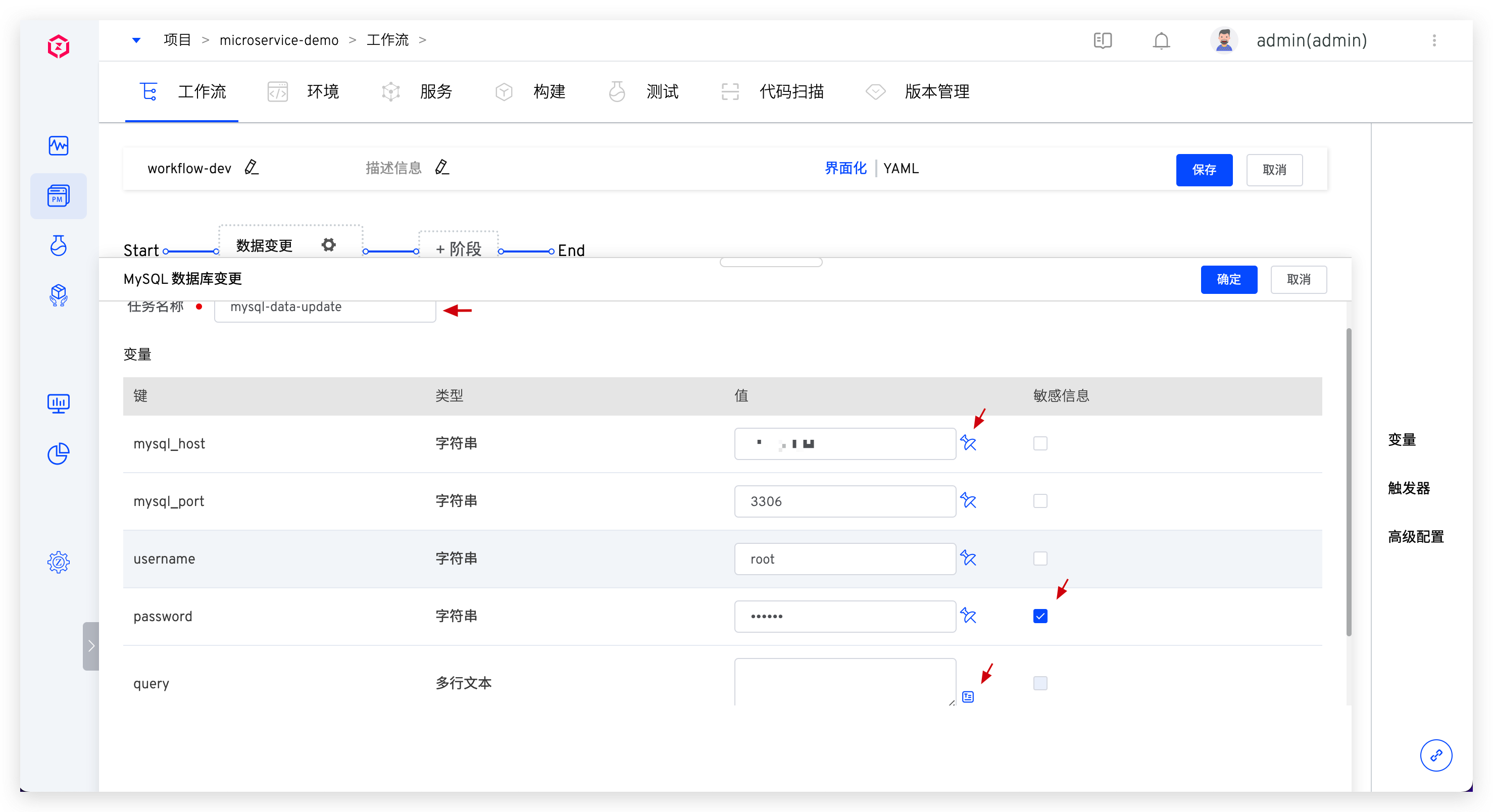 mysql-data-update-> 填写变量的值,本例中配置说明如下:mysql_host:MySQL 数据库的地址,指定为固定值mysql_port:MySQL 数据库的端口号,指定为固定值username:MySQL 数据库的用户名,指定为固定值password:MySQL 数据库的密码,指定为固定值并设置为敏感信息query:要执行的 SQL 脚本,指定为运行时输入