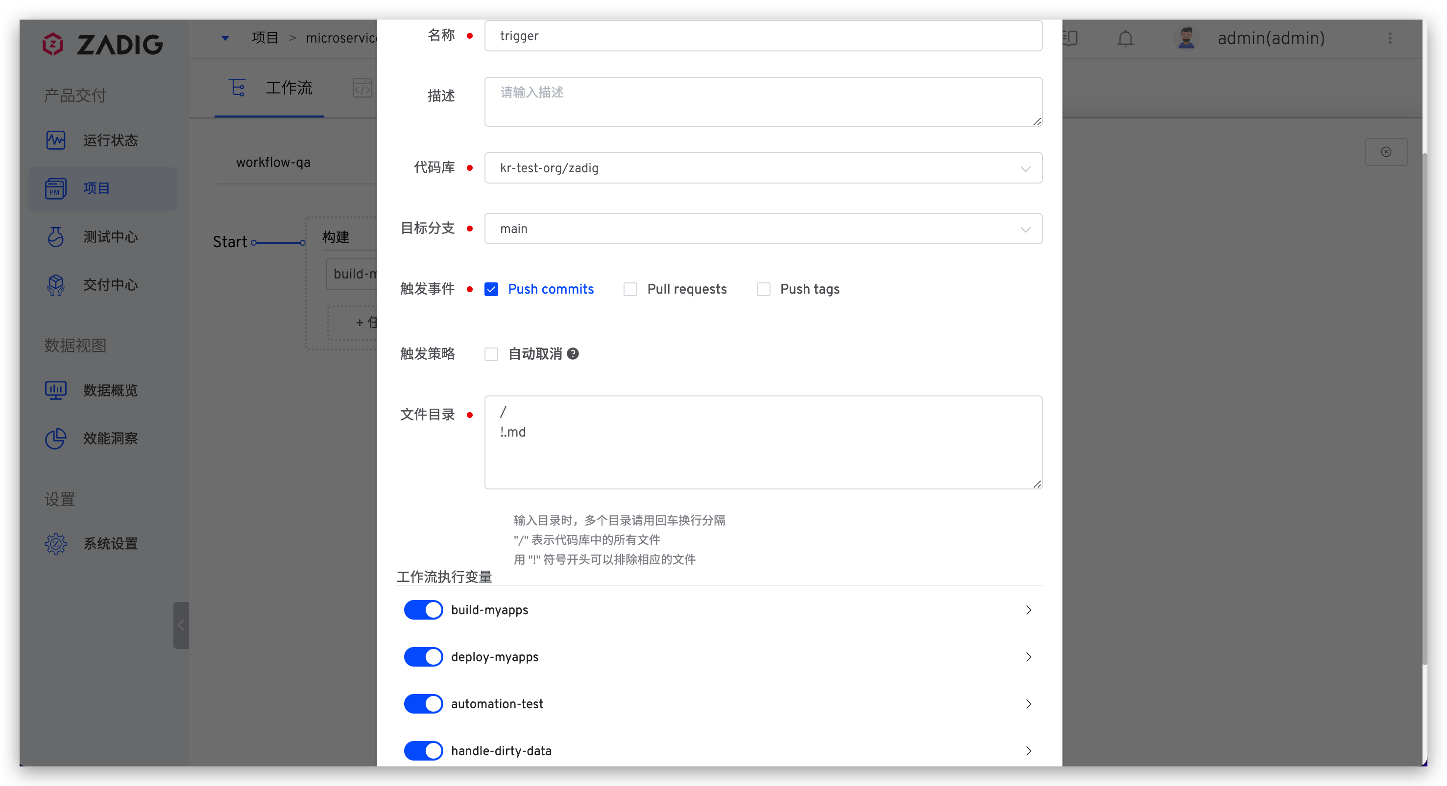 workflow-qa-> 点击触发器 -> 配置代码库信息、触发事件和工作流执行变量等。 - 修改代码并提交到代码库后,会触发工作流执行,自动完成
