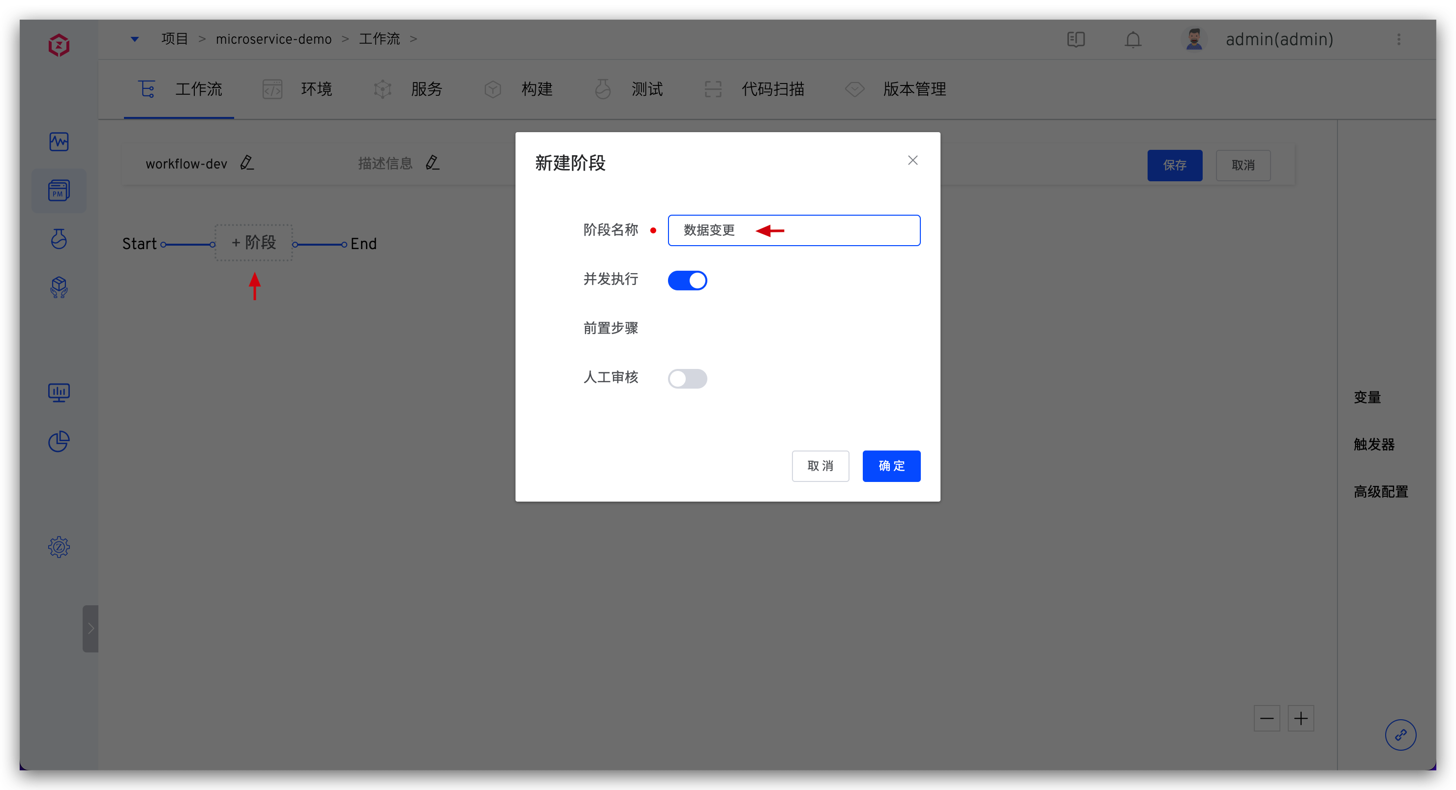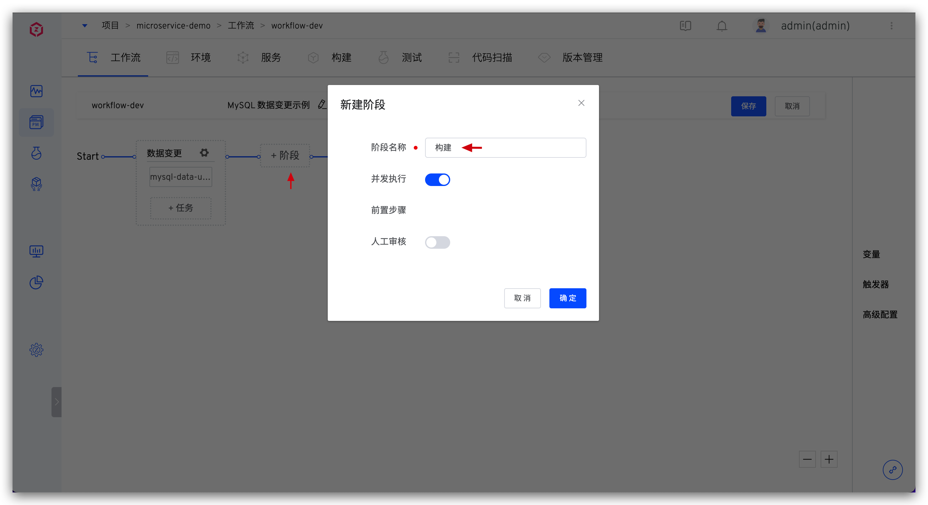 +阶段-> 填写阶段名称数据变更。 - 添加任务:点击