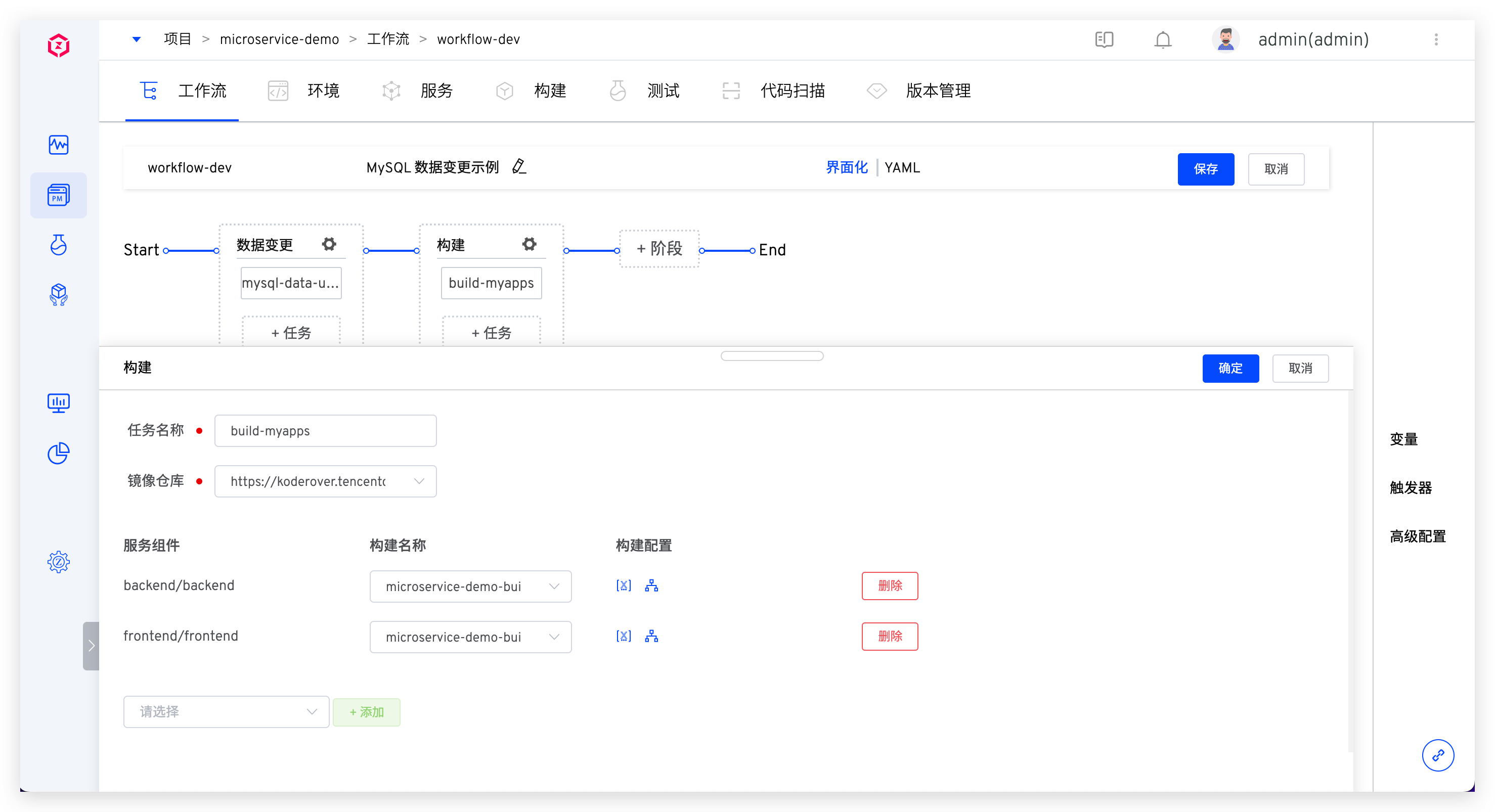 build-myapps-> 选择镜像仓库 -> 选择服务组件及构建名称后点击确定。