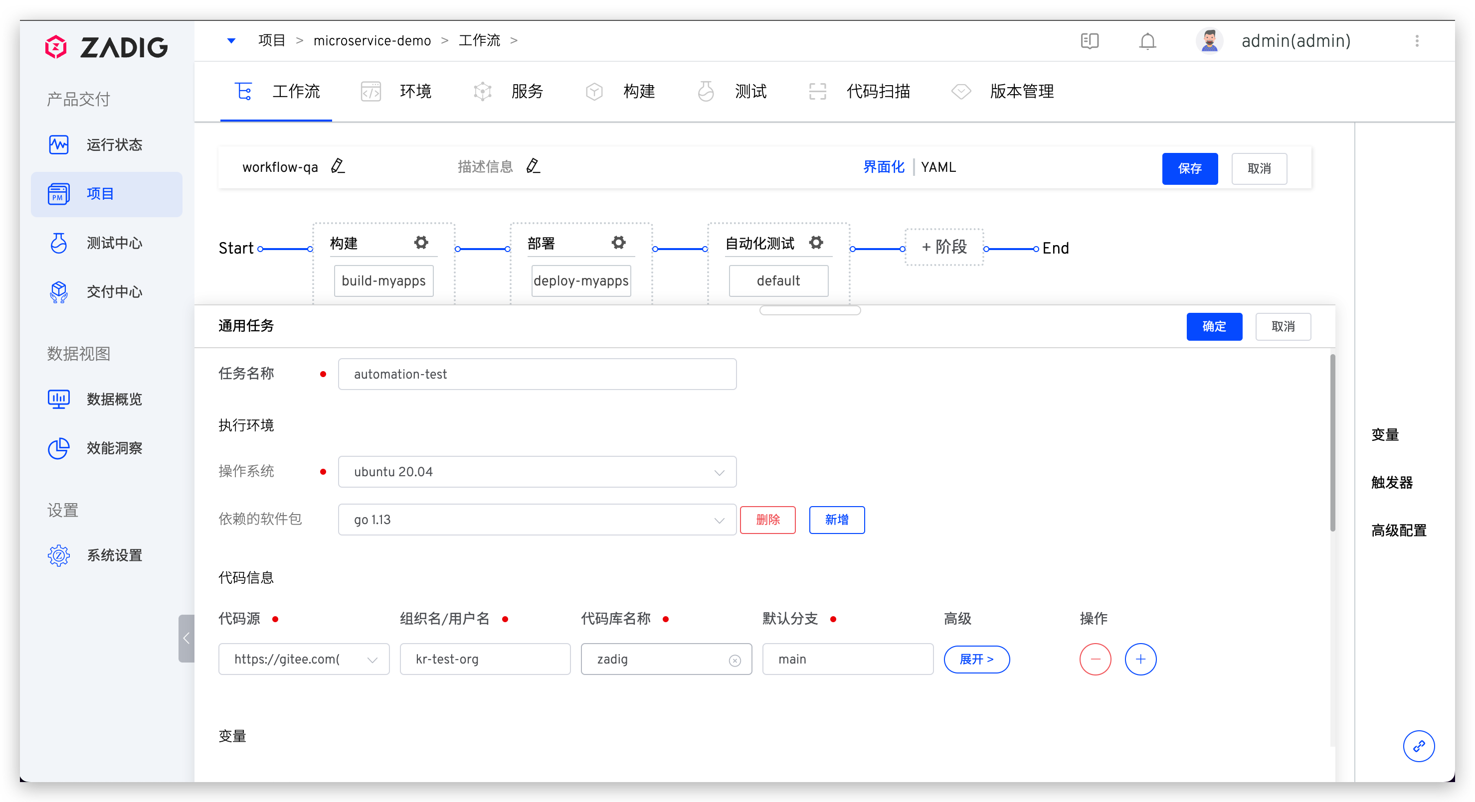 其中新建自定义工作流 workflow-qa、配置构建任务 build-myapps、部署任务 deploy-myapps 参考实践一,此处不再赘述,下面详细介绍自动化测试和数据清理任务的配置。