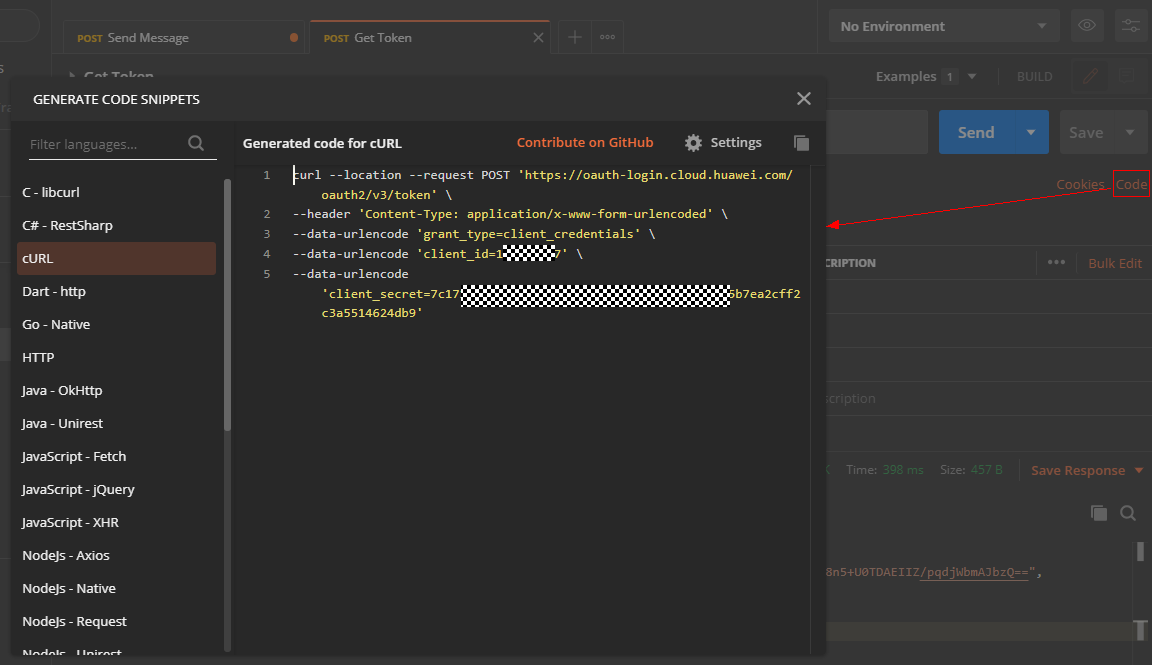 使用Postman已有的调试成功的接口,可以自动生成其他工具的命令,如常用的cURL、Nodejs、Python、Ruby等,可以直接复制使用。