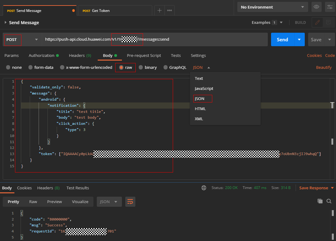 - 选择Body,选中“raw”,下拉框选择“JSON”,然后在下方输入框中复制消息内容,点击send,就可以发送消息了,如下图:
